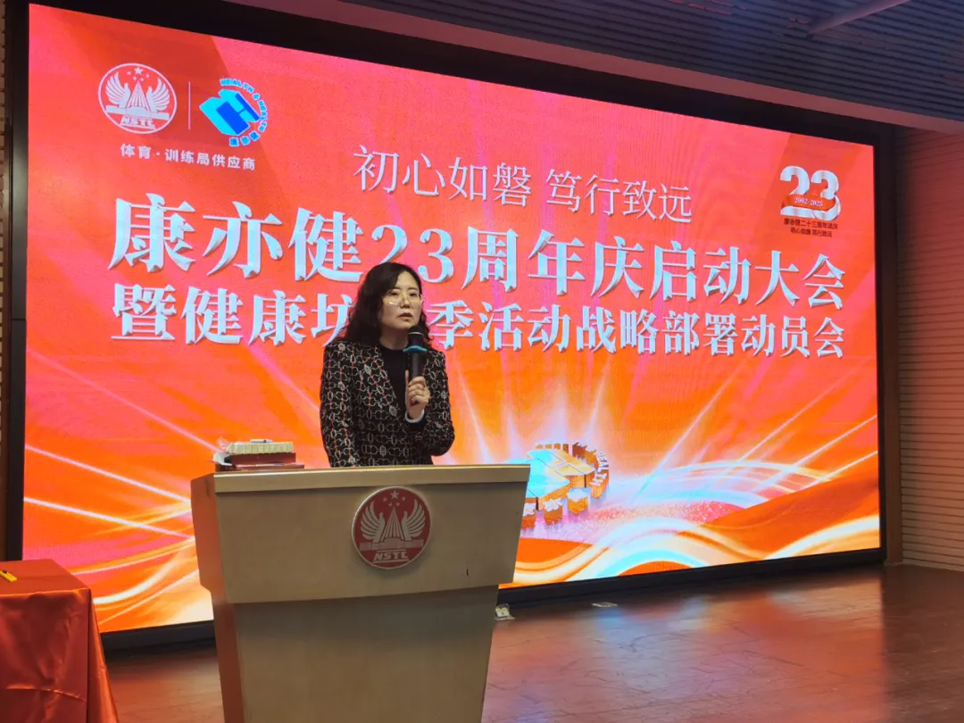作为康亦健的战略伙伴,国家体育总局训练局副局长周秋瑞亲临会议现场,并对康亦健 23 周年表达了热烈祝贺。她表示:“康亦健多年来始终致力于中国体育,为推动体育事业的发展做出了积极贡献。在过去的合作中,我们见证了康亦健的成长与进步,也看到了他们为提升全民健康水平所付出的努力。值此 23 周年之际,我代表国家体育局训练局,向康亦健表示最诚挚的祝贺,祝愿康亦健在未来的发展中取得更加辉煌的成就!”