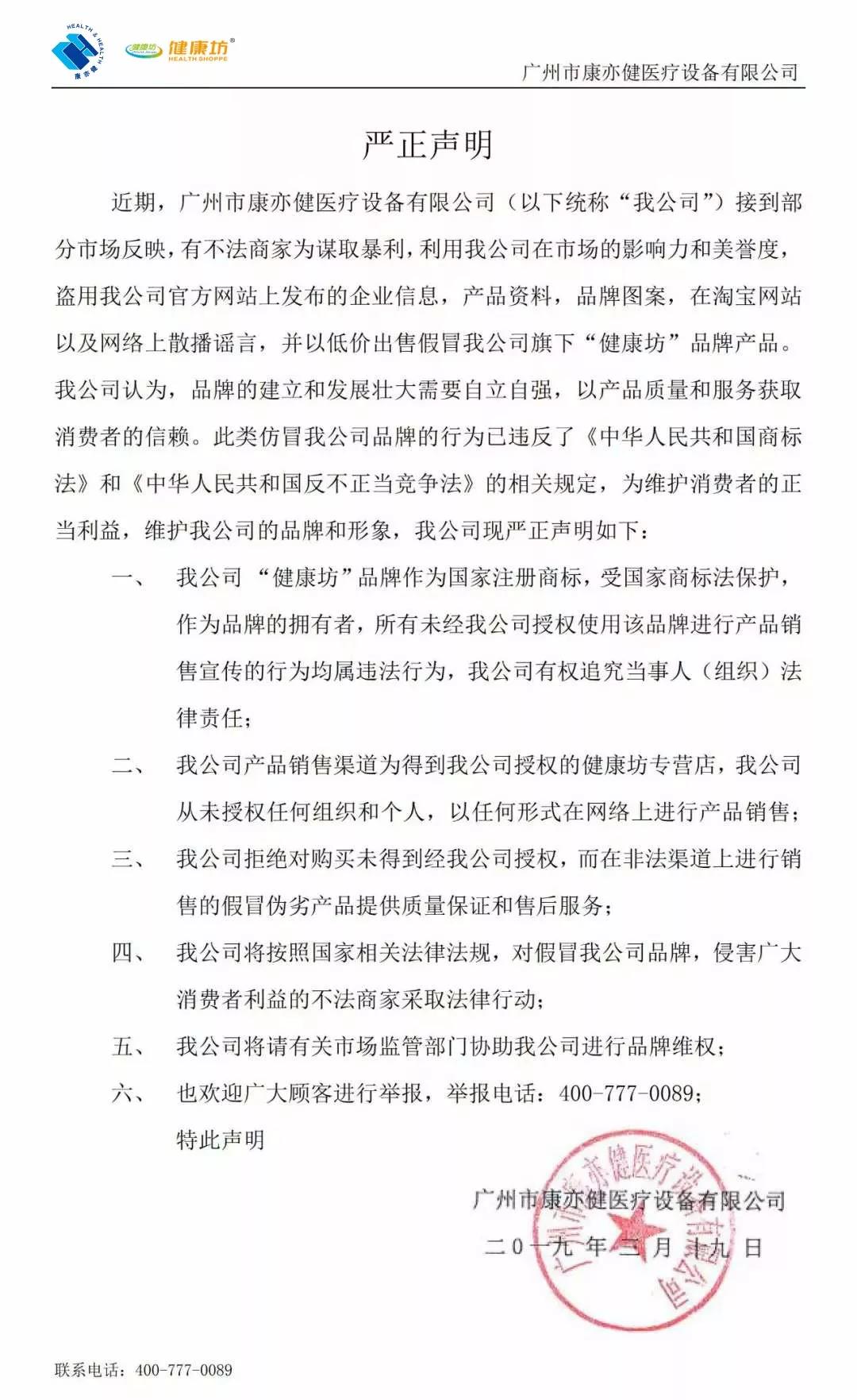 特此声明,我公司将对已发现的假冒我公司品牌的不法商家进行逐步曝光,也请广大消费者提高警惕,避免不必要的损失!认准健康坊品牌,从正规渠道购买!